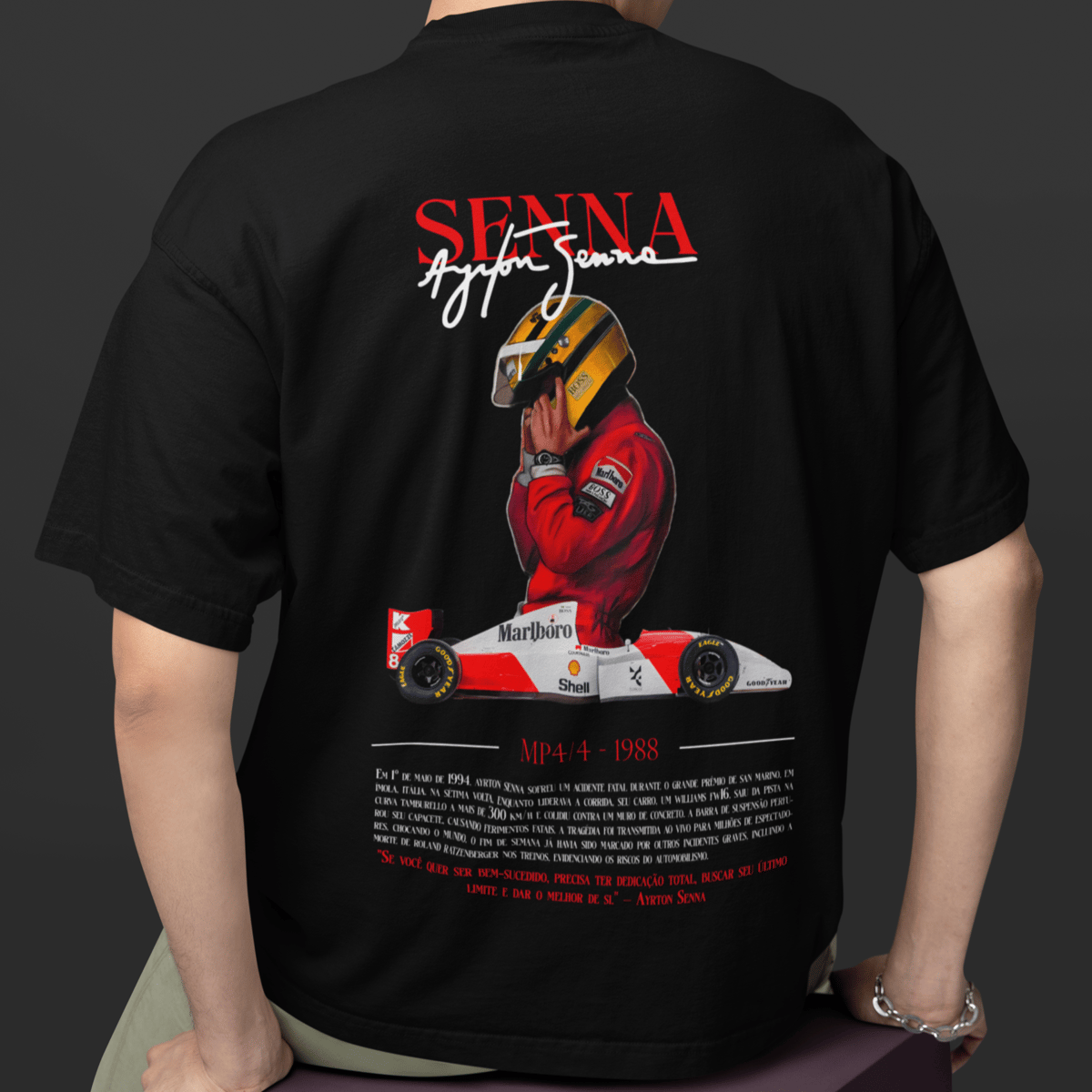 Com uma estampa exclusiva e cheia de significado, esta camiseta em padrão algodão une conforto e estilo para que você leve a lenda consigo onde quer que vá. Vista o legado de um herói que ultrapassou as pistas e marcou gerações.